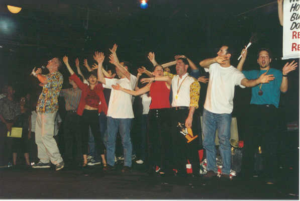 Andy, Steve, Alex & Florette ("One short of a Foreskin"), Jodie and Julie ("The Spice Maydels") in the foregound; plus Justin and Dave ("Conspiracy"), Jason, Josh and Mark ("Shmux in Tux") give a rousing rendition of the Theatresports Anthem.