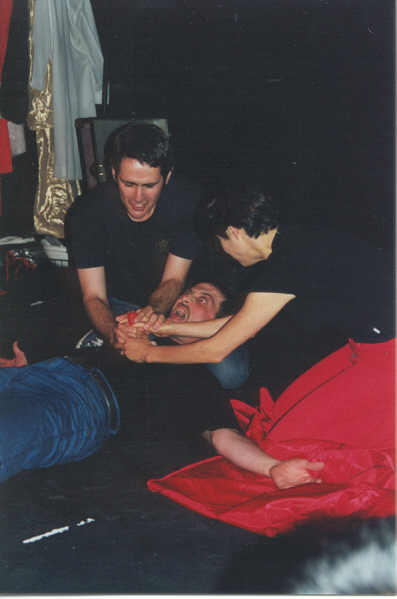 "This Won't hurt a bit". Shmux in Tux medicos Andy Greenfield and Matt Foster give Jason Elias a bit of his own medicine.